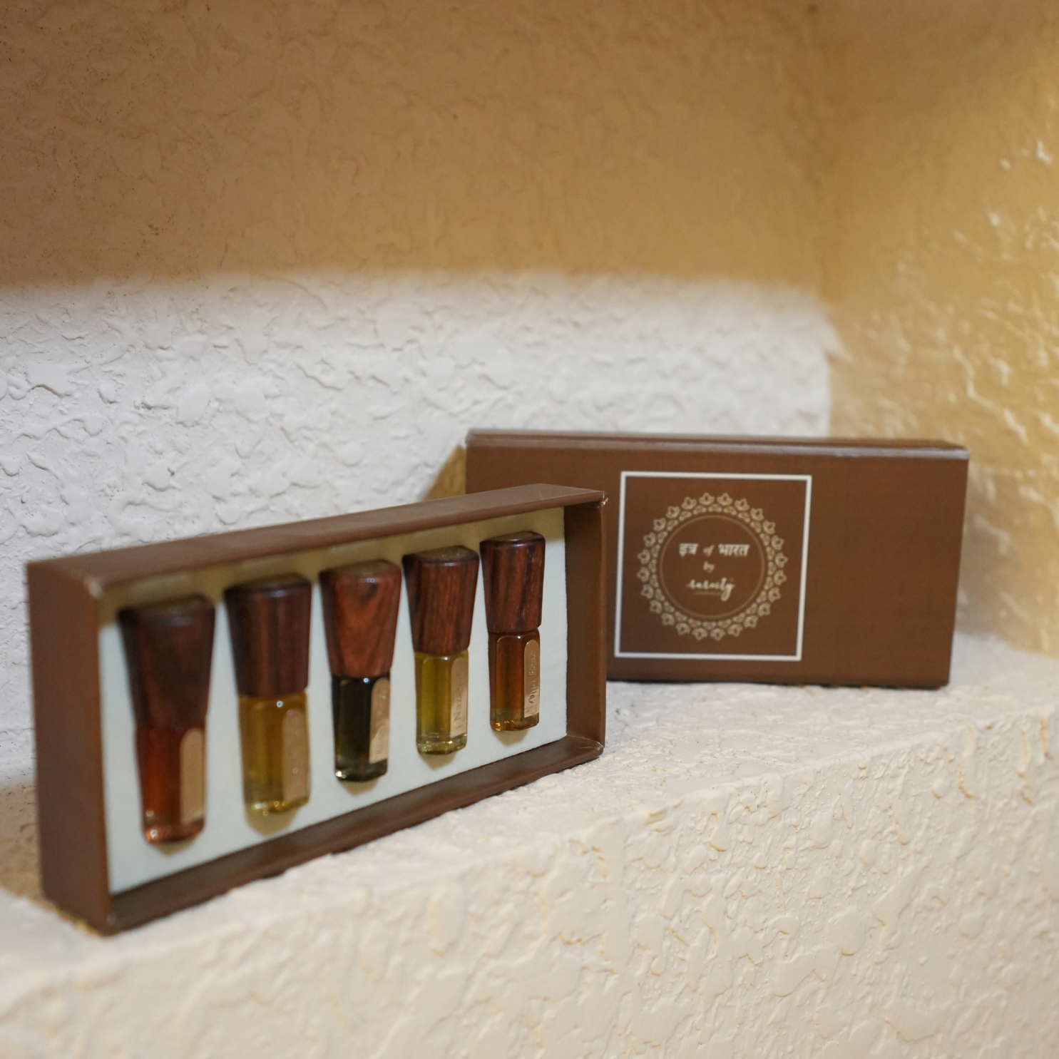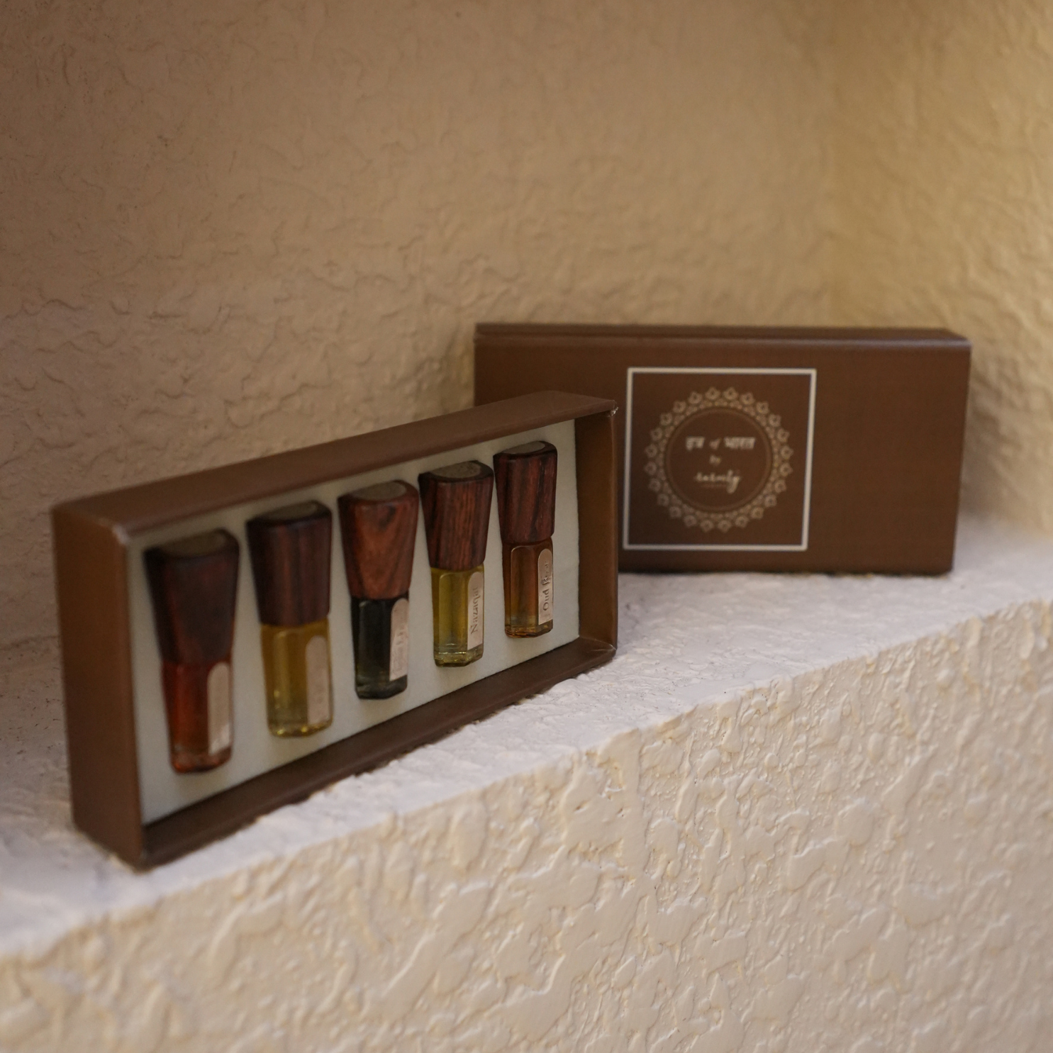 Discover the Mystic Mini Ittar Box Set of 5, curated for connoisseurs of refined fragrances. This exquisite collection includes: